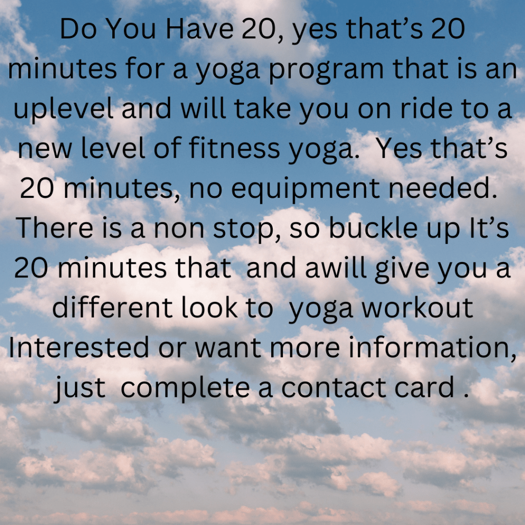 OH my goodness. And I lift weights prior to the yoga workout for 40 minutes. Being honest in 20 minutes, I was wowed. Of course I fumbled, I tumbled, but I got it together. And what I achieved in 20 minutes was great. It is Yoga on steroids but without equipment and fast, also having fun. In 20 minutes. If this is of interest to you. Come ono ver. I need you to mastermind Your fitness level.