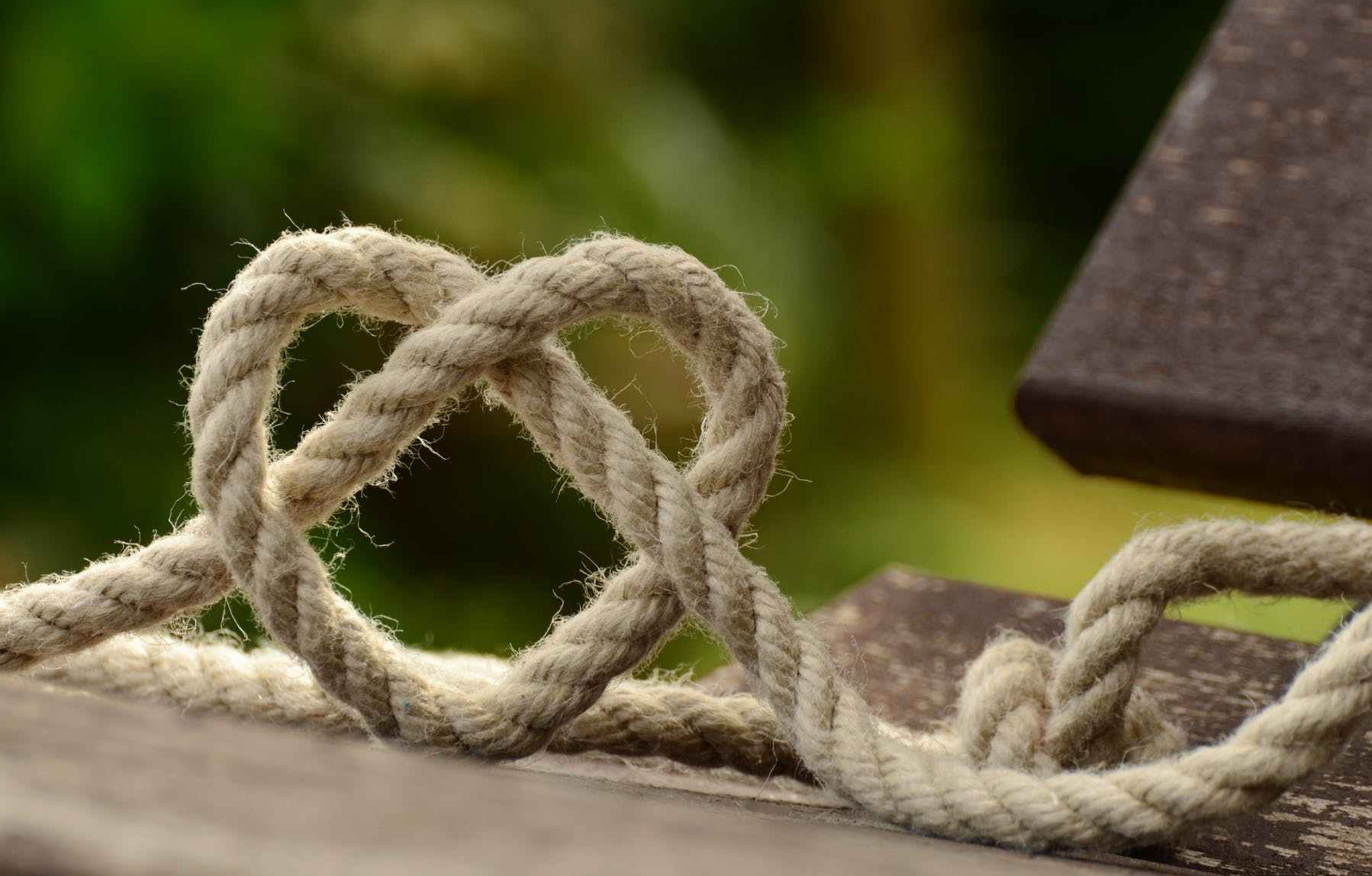 brown rope tangled and formed into heart shape on brown wooden rail